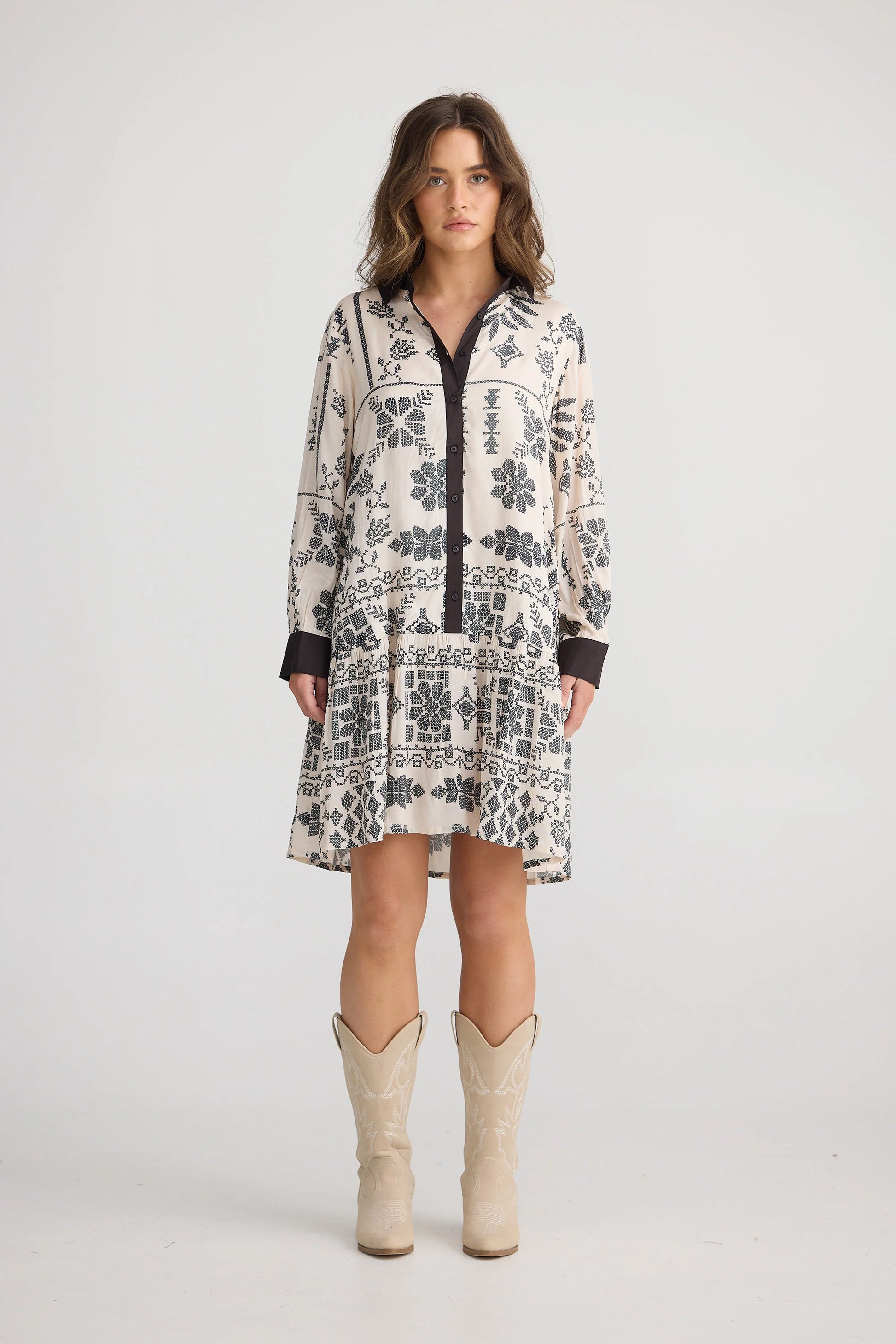 - Classic shirt collar with button through front