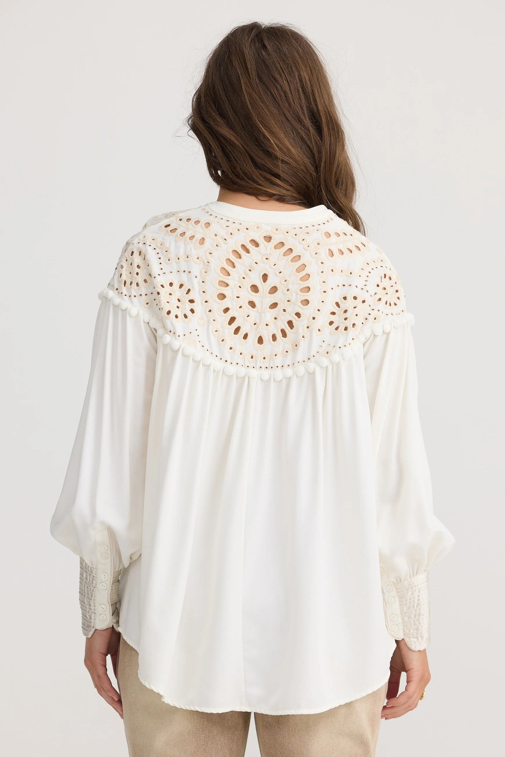 - Pom-pom trim along yoke seam