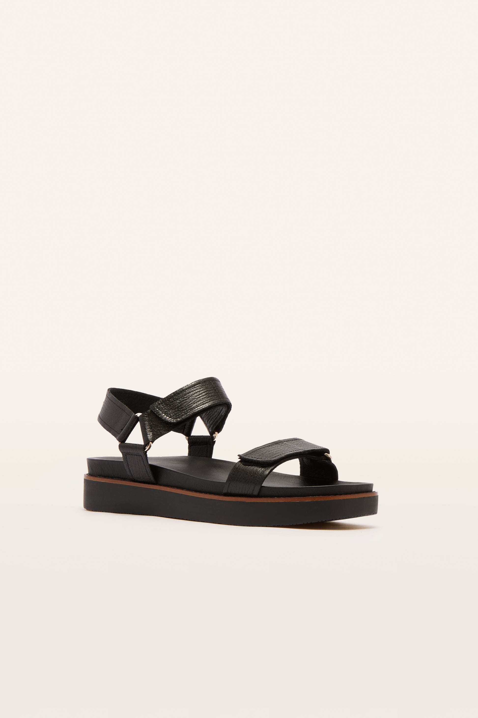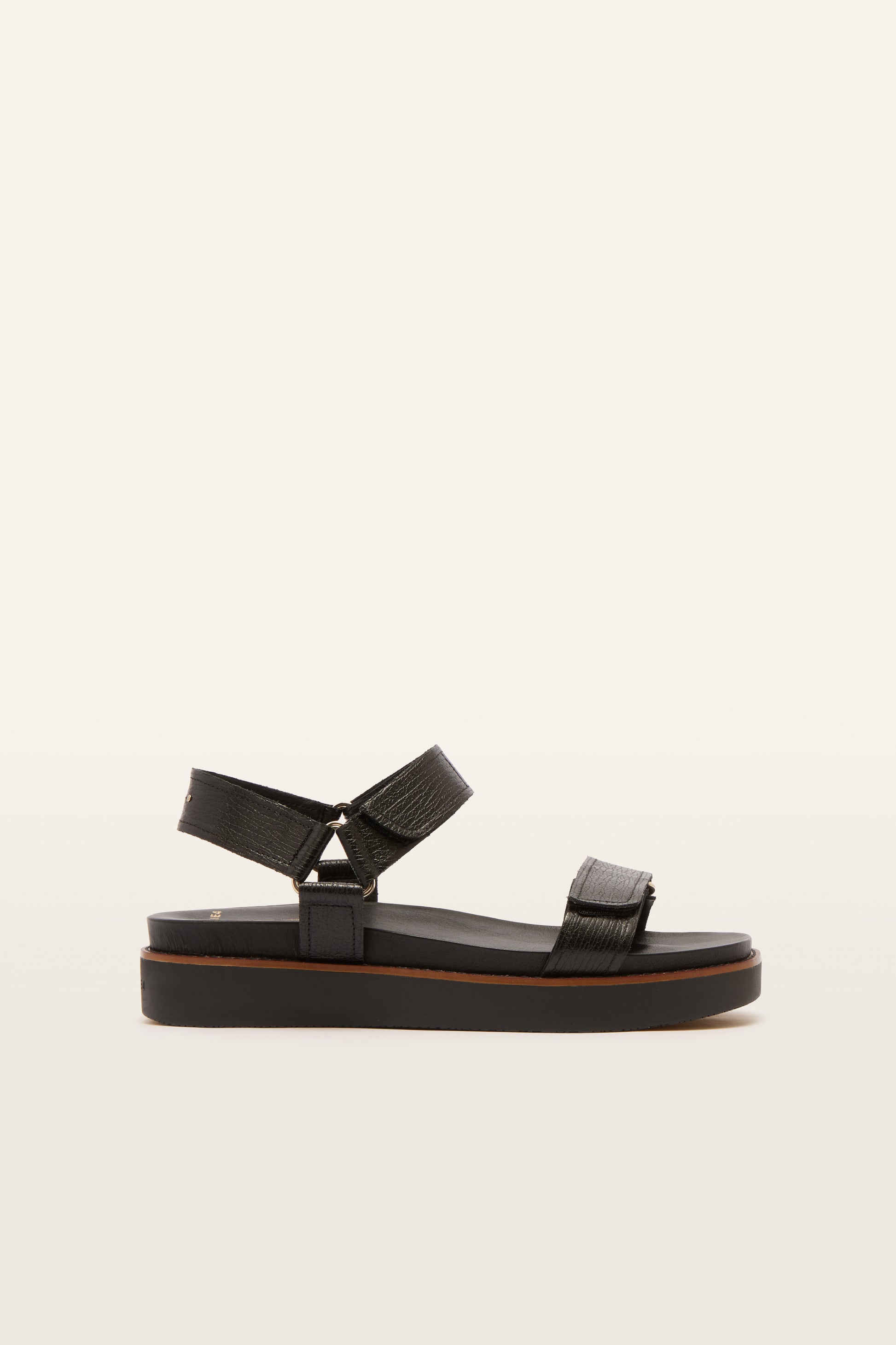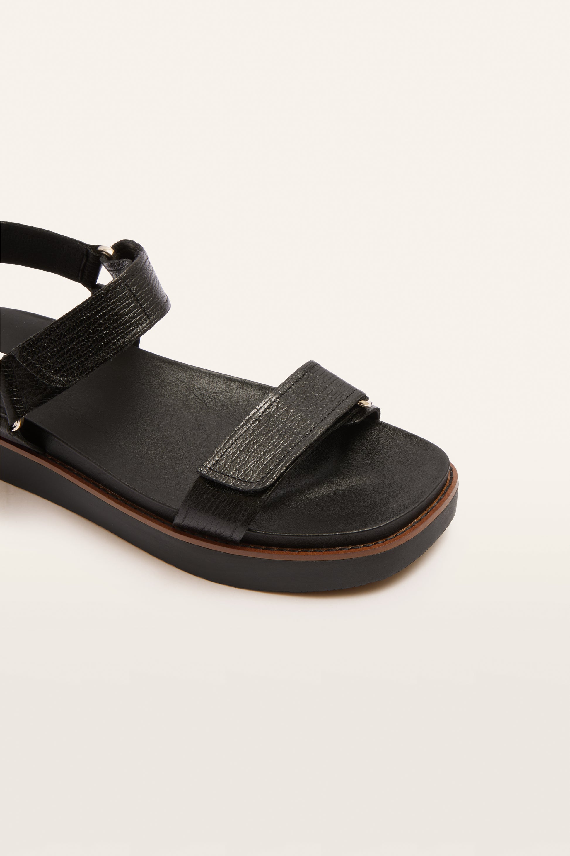 The staple that makes a statement—Zane in sleek Black Grain. Featuring a convenient hook and loop system, a layered support and cushion system, and a flatform sole with our podiatrist-designed footbed, contoured to support and moulded for comfort. Quality leather with a textured finish and contrasting detailing on the rand gives luxe appeal to a sporty aesthetic.